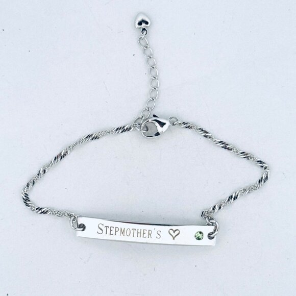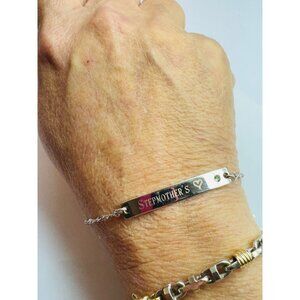 This Estate Sterling Silver 925 Bar Bracelet features an engraved “Stepmother’s ♥” design with a sparkling gemstone accent. The elegant twisted chain is adjustable from 7 inches to 8 inches for a comfortable fit, secured with a lobster clasp and heart charm extension. The bracelet weighs 5.18 grams and is stamped 925 for authenticity. A meaningful and stylish gift or keepsake.