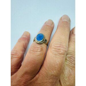 This beautiful estate ring features a genuine oval cabochon Lapis Lazuli gemstone bezel-set in solid 925 sterling silver. The stone is framed by a twisted rope border, adding vintage-style charm. Each side of the band includes a delicate cutout heart detail for a touch of romantic design. The ring is marked "925" on the inner shank, confirming its sterling silver content. A unique and meaningful piece with a bohemian or artisan feel, perfect for stacking or wearing as a statement on its own.