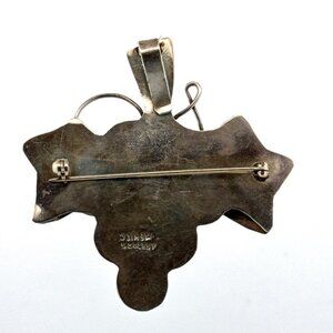 This vintage estate brooch features a beautifully crafted grape cluster design with detailed leaf accents, made from solid sterling silver (.925). Marked "JSU 925 MEXICO," it showcases the skilled artistry of Mexican silversmiths. The brooch measures approximately 63.4mm in width and weighs 31.4 grams, making it a substantial statement piece. It is fitted with a secure pin back clasp and a generous bail, allowing it to be worn as either a brooch or a pendant. A timeless accessory that reflects classic vineyard-inspired elegance, perfect for collectors or anyone who appreciates fine silver jewelry.