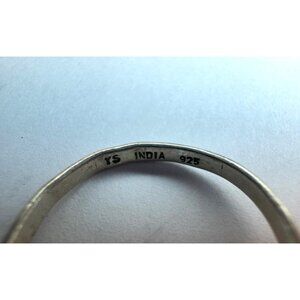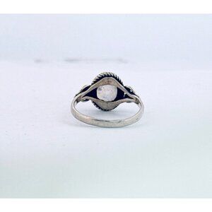This beautiful estate sterling silver ring features an oval cabochon-cut natural moonstone with a stunning adularescent glow, displaying flashes of blue and white under the light. The bezel setting is framed with a twisted rope border and accented by decorative bead detailing on each side, giving the piece a timeless bohemian charm. The ring band is marked “TS INDIA 925”, confirming it is crafted from genuine sterling silver.
