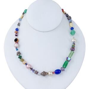 A colorful artisan estate necklace featuring an eclectic mix of glass, crystal, pearl, and stone beads, finished with a sterling silver clasp. Unique, vibrant, and full of personality — a one-of-a-kind piece for collectors and creative jewelry lovers.