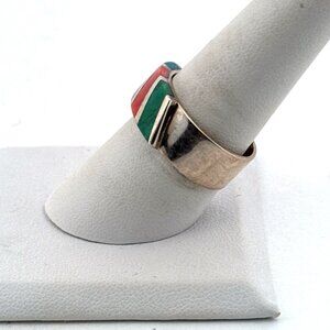 • Estate Sterling Silver 925 Multi-Stone Inlay Ring Blue Green Red Band Size 8