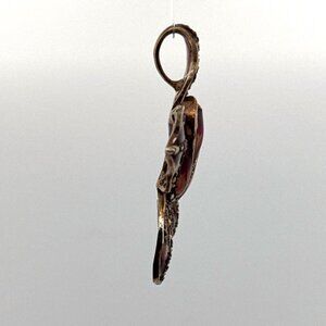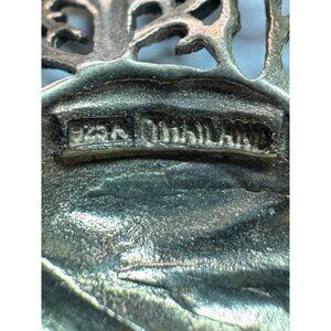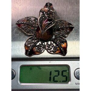 Beautiful estate orchid flower pendant crafted in Sterling Silver 925 with intricate marcasite accents and rich purple enamel inlay. The pendant showcases detailed filigree work with a dimensional orchid blossom design. It measures approx. 46.6 mm in length and weighs 12.5 grams. Bail is large enough for various chain styles. Pendant only – chain not included.