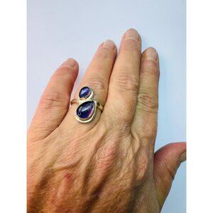 Description: This stunning Estate Sterling Silver 925 ring features a unique open bypass design showcasing two vibrant pear-shaped amethyst cabochons. The rich purple hues of the stones are accentuated by the polished sterling silver bezel setting, adding a touch of sophistication. This size 8 ring weighs 6.43 grams and is perfect for everyday wear or special occasions. A timeless piece for collectors or amethyst lovers, this estate ring is in excellent pre-owned condition.