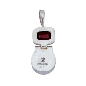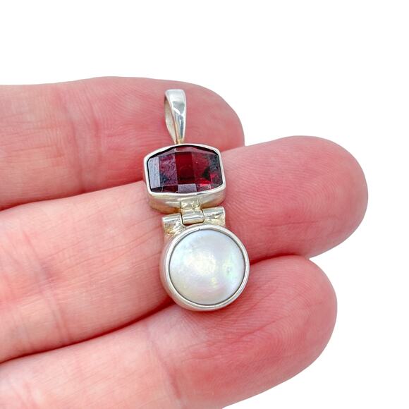 Estate sterling silver 925 hinge pendant featuring a luminous white pearl paired with a deep red garnet accent. The articulated hinge design adds elegant movement, making this a beautiful vintage gemstone piece for collectors, pearl lovers, or anyone who enjoys classic silver with a pop of color.