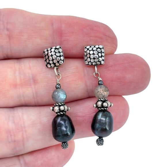 Elegant estate sterling silver earrings featuring a modern pebble-square design paired with luminous black pearls and glowing labradorite drops. The mix of iridescence and earthy shimmer gives these 925 silver dangles a refined, organic feel perfect for everyday wear or dressy styling.