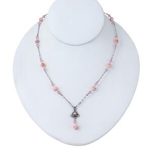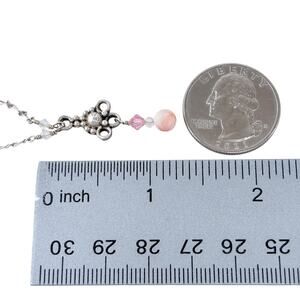 Estate sterling silver 925 shell and crystal necklace featuring soft blush shell beads paired with faceted pink crystal accents along a delicate silver chain. Finished with a graceful drop charm, this piece has romantic, feminine appeal and layers beautifully with everyday jewelry.