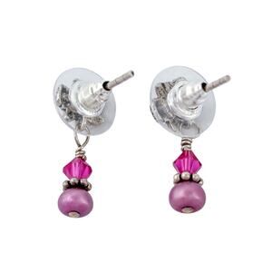 Lovely estate sterling silver earrings featuring a floral-inspired design with purple pearls and soft pink crystal accents. Lightweight with pretty movement, these feminine dangles add a sweet pop of color to any outfit.