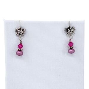 Estate Sterling Silver 925 Purple Pearl Pink Crystal Floral Dangle Earrings