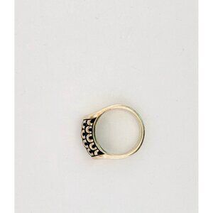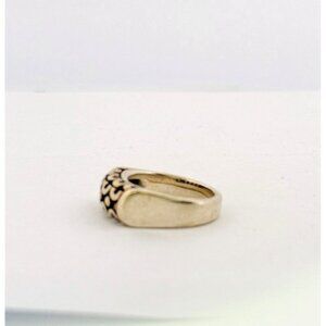 This estate sterling silver 950 ring features a bold, rectangular top with an intricate geometric repeating arc pattern in oxidized black relief, creating striking contrast and texture. Crafted from high-purity 925 silver, it showcases superior craftsmanship and a solid, substantial feel at 8.5 grams. The ring has a wide tapered shank for comfortable wear and durability. Inside the band is a hallmark featuring three vertical marks, “JH” initials, and STER, confirming authenticity and silver content.