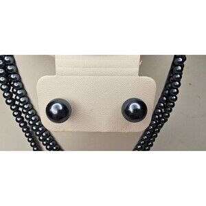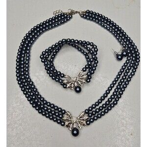 Estate Style Triple Strand Faux Blue Pearl & Rhinestone 3 Piece Jewelry Set