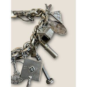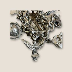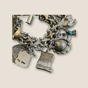 Vintage Charm m bracelet including 15 charms most are Sterling . Please see photos. Charms include Christus gardens Gatlinburg Sterling, Vintage Capricorn Charm, Sterling, Rockville Indiana Barn charm, diploma Sterling, Cedar Point Ohio, Sterling, 1953 graduation cap, Sterling, Kings Island, Sterling, Heart engraved with the name Claudine, Horse shoe with rider, Native bird shaman, globe, Lincoln Address, Sterling, Bi centennial charm, and New Orleans charm, Sterling.