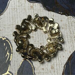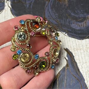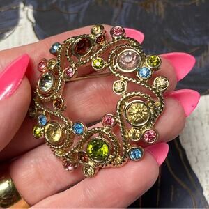 Estate Vintage Large Gold Brooch with Scrollwork and Multicolor Gemstones D1