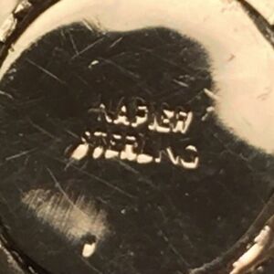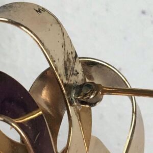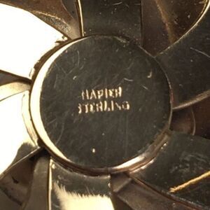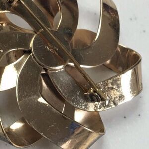 Vintage VTG Napier Sterling Silver Gold Plated Bow Brooch Signed Statement Jewelry 22g A signed Napier 925 sterling silver, ribbon or bow brooch with a ball at the center. This pinwheel brooch is in fair condition wear throughout: There are scuffs and scratches on the gold plating and some tarnishing, most notable on the back. This sterling silver piece weighs about 22g. Mid-Century Modern, MCM retro costume jewelry, circa 1940s or 1950s.