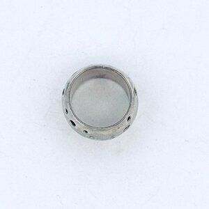 This Estate Vintage Sterling Silver Ring features a bold wide-band design, handcrafted in solid 925 sterling silver with an oxidized crater-like finish. The artisan-inspired surface is uniquely pitted with various-sized holes, creating a textured, lunar or volcanic rock aesthetic. It has a thick band width of 11.7mm and weighs 5.3 grams, offering a comfortable yet substantial feel on the finger. Ring size is a US 7, making it perfect for those who love statement pieces with a rustic, organic vibe. This ring is ideal for everyday wear or as a distinctive gift.