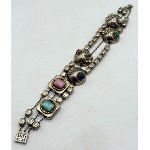 Estate beaded charm vintage chain slide bracelet. Super well made with filigree box clasp. Beaded three strand slide bracelet. Glass stones, pearls and flower design. Vintage estate slide bracelet. MN54GH.
