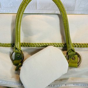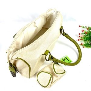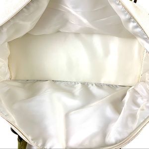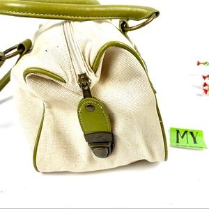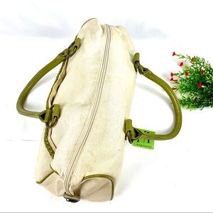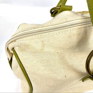 Estée Lauder canvas beige travel bag with light green leather accent travel bag and a matching make up tote. There is a slight staining please reference images, hardly noticeable. The bag is in good condition.