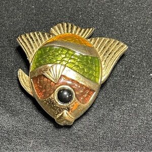 This Vintage, collectible Estee Lauder fish decor piece showcases a vibrant blend of orange and green hues, perfect for adding a touch of elegance to any space. Its rounded, disc-like body and prominent fins create a striking silhouette, while the textured surface mimics the natural beauty of scales. Ideal for enhancing your home or office with a splash of color and sophistication.