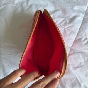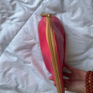 Keep your essentials organized in style with this Estée Lauder pink mini cosmetic bag. Made from a durable, wipeable material with a fun polka dot texture, this makeup pouch is perfect for travel or everyday use. It features a secure zip closure, tan trim, and a spacious interior to hold your beauty must-haves.