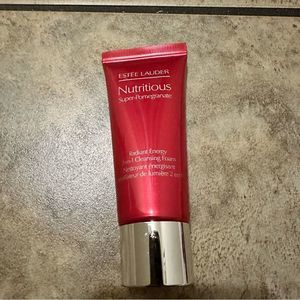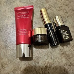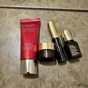 Estée Lauder samples of sumptuous extreme mascara in shade extreme black, advanced night repair cream, night repair eye cream, and radiant energy 2 in 1 cleansing foam. All products are brand new never used. The purple tote is open with no zipper and is approx. 20in. Long with the height at approx. 12in.