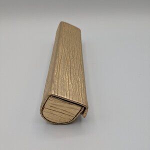 This vintage 1990s Estée Lauder gold textured long lipstick case features a snap closure and an interior mirror, and is pre-owned with some minor wear due to age. It measures approximately 6.25" in length.