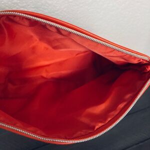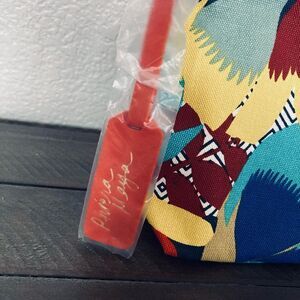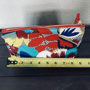 New zippered cosmetic makeup storage bag in excellent unused condition. Colorful floral fabric Estée Lauder Riviera Maya Mexico beautiful printed pouch with Orange, blue, maroon, aqua, yellow color tones.