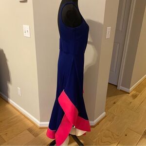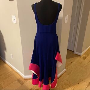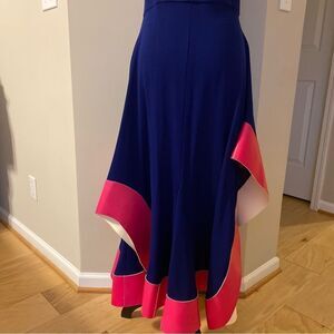 Stunning Esteban Cortazar Paris Collection flamenco dress in royal blue with a fuchsia trim. The trim is stiff, unlike the rest of the dress fabric. The dress features a side zipper with a hook and eye closure, a low neckline and back, and a fitted upper portion. It has no flaws and was worn only once. Crafted in Paris, France. This dress is from the Esteban Cortazar Paris Collection and is not from the less expensive Esteban Cortazar Collective line. This dress is rare compared to the cheaper ones from the Esteban Collective line, which was made for RTR.