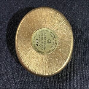 This stunning solid perfume compact by Estee Lauder showcases a beautifully carved cameo set against a deep navy blue background, encased in a luxurious gold frame. The intricate detailing of the side profile adds a touch of timeless elegance, making it a perfect accessory for any sophisticated ensemble.