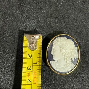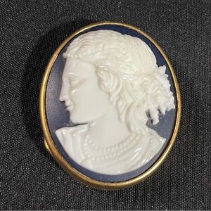 This stunning solid perfume compact by Estee Lauder showcases a beautifully carved cameo set against a deep navy blue background, encased in a luxurious gold frame. The intricate detailing of the side profile adds a touch of timeless elegance, making it a perfect accessory for any sophisticated ensemble.