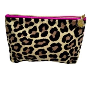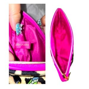 Chic Estee Lauder clutch with vibrant pink interior. Eye-catching leopard print exterior. Ideal for stylish outings.