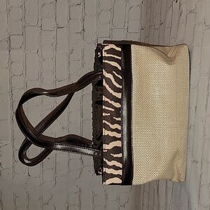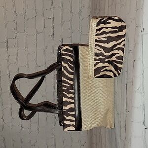 Estee Lauder Mini Tote with coin purse Tan Burlap and Brown and Tan Zebra Print