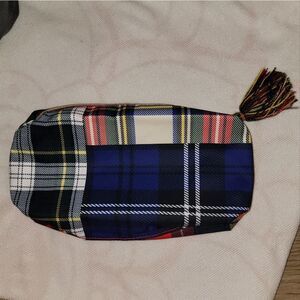 Like new condition and damage free. Colorful plaid cosmetic bag with big Estee Lauder logo. Features a tassel accent. Made of recycled materials.