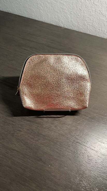 Estee Lauder Rose Gold Shimmer Cosmetic Makeup Bag. This stylish pouch is perfect for organizing your beauty essentials whether at home or on the go. Featuring a beautiful rose gold shimmer finish and a durable zipper closure. Ideal for storing makeup, toiletries, or small accessories. Excellent pre-owned condition, with no visible flaws. Add a touch of glamour to your daily routine.