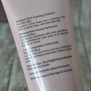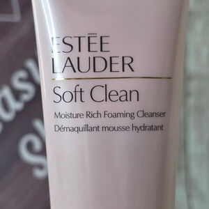 This is a new, unused Estee Lauder Soft Clean Moisture Rich Foaming Cleanser, without original packaging. The cleanser is in a light pink tube with black and gold lettering. The tube is made of a flexible plastic material and contains 4.2 fl. oz. / 125ml of product. It is designed for dry skin. The tube is sealed with a matching pink cap. There are no visible imperfections.