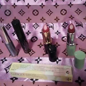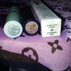 Mascara, lipstic, chubby stick for eyes. Lipstick: crystal pink creme, a different grape. Mascara: both black. And chubby stick curvaceous coal 08.