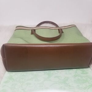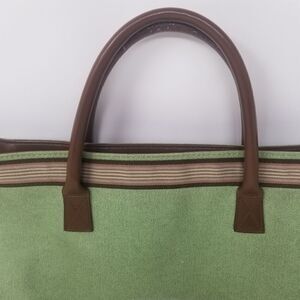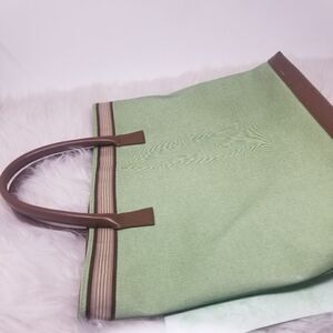 Approximate measurements are 14" x 11" x 4". Handle is approximately 17". Has a few marks inside. Very light wear. Nice clean canvas tote.
