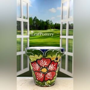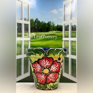 Dimensions:7.25”H x 8”W, Opening 7”, weight 2lbs 8.3oz, Drainage hole, Type: Barrel Planter, Materials: Clay & Ceramic, Hand painted and made in Spain, Color: Multi Colored, Perfect for Indoor/Outdoor gardening, Don’t forget to dress up your plants 🪴