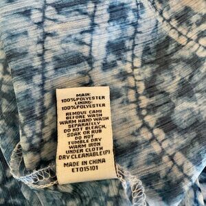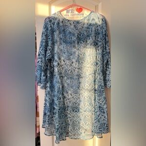 Estelle Abstract Print Tunic Blouse.  Blue & White, 100% Polyester. Includes White Tank Lining. Scoop Neckline and Trumpet 3/4 Sleeves. Hi-Lo Hem, much longer in the back. Size 3X measures 50” Chest x 28” Length in front x 35” Length in the back. Worn 1X to a wedding and then dry cleaned. Pristine/Like New