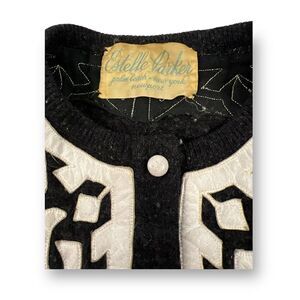 No size or material tag present. Size was determined by measurements. Please refer to measurements to ensure fitment. Hem line is missing the stitching for the right side and will need to be repaired so it does not come unfolded during wear. Some discoloring in the white details.