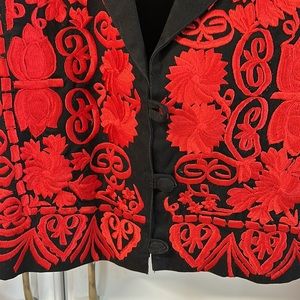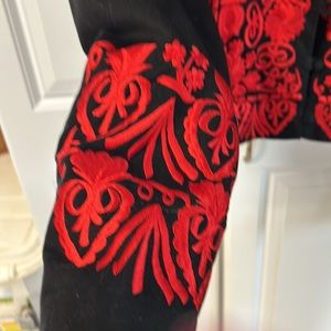 Estephanie Jacket, large, black fully lined embroidery front & sleeves in red.