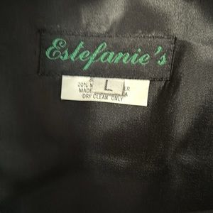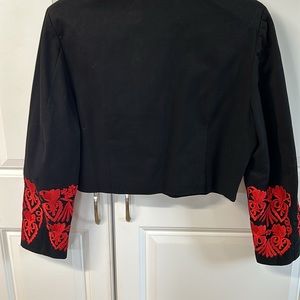 Estephanies, Beautiful bolo jacket! embroidery on front and lower 1/2 of sleeves. Black with red embroidery. Fully lined Size L one top button missing. Like new. Length shoulder to bottom 18” bust 44 around. A real eye catcher! Princess cut tailored seams in back.(note top button 1 missing) same material. No other flaws. Gorgeous latino look! Waist high
