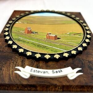 Estevan, Sask Wall Plaque Vintage Souvenirs 5 x 6 " wood FARM Picture inbox