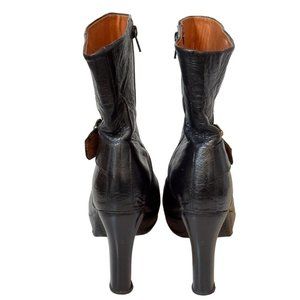 Estilmoda presents vintage black leather booties for women, featuring a stylish ankle cut, round toe, side buckle, and side zip. The platform chunky heel and rubber soles add comfort and flair to any dressy outfit.