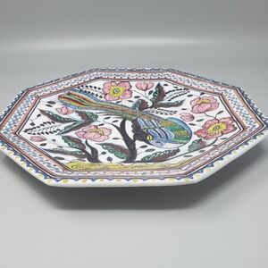 The octagon-shaped bird plate is hand-painted with vibrant colors. Made from ceramic and signed on the back. Measures 9.25" square. Made in Portugal. In excellent condition with no chips or cracks. Will ship out with care.