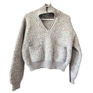 Et Clet Gray Cropped Long Sleeve High V Neck Fuzzy Knit Sweater sz S with Two Front Pockets