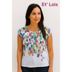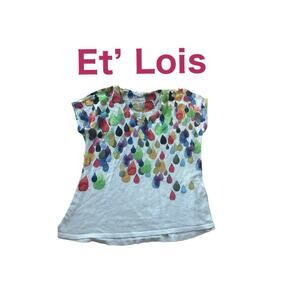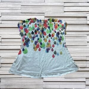 Very versatile! Dress up with your favorite pants or skirt or pair with jeans. Paint drop design on white background. Shades of green, red, purple, black, yellow, blue, pink, orange. Excellent smoke free condition.
