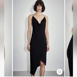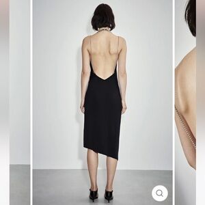 Slip on your next little black dress, elevated by sculptural design and modern tailoring. Heavily inspired by the female form and the everlasting beauty she evokes—our midi dress is crafted with gloss jersey, flaunting a mesmerizing sheen throughout its canvas. Framed by an alluring neckline—it features metal chain straps, an asymmetrical hemline, and an open back.