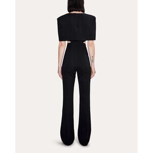 Introducing a jumpsuit crafted with power viscose—giving its streamline silhouette a high compact stretch—while Italian-made fabrics are tailored throughout. Framed by its seductive V-neck opening, this stunning piece features padded shoulders and cut out detailing at the underbust. Final touches include a capelet at the back.