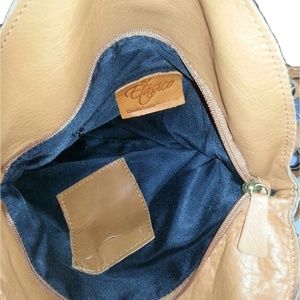 Brushed brass tone hardware. Magnetic top closure. Top zip closure. Leather zipper poly.Slip wall leather pocket. Zip wall pocket.