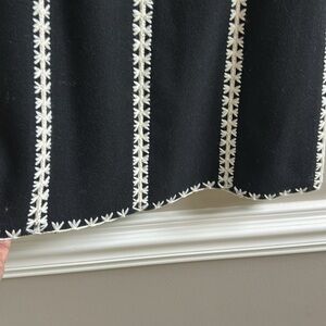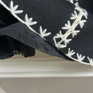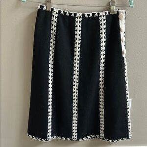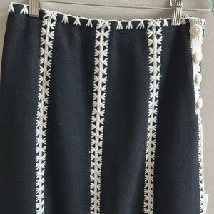 Etcetera Black Cream Wool A Line Embroidered Midi Skirt. Lined. 70% wool, 30% polyamide. Size zipper. Decorative buttons at zipper. Size 0
